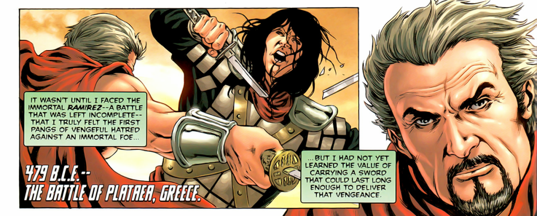 ALGUNOS DE SUS VIAJES.EN LOS COMICS PUBLICADOS POR DYNAMITE SE REVELAN VARIOS ENCUENTROS ENTRE CONNOR Y KURGAN ANTERIORES A LA REUNIÓNEN LA MINISERIE “WAY OF THE SWORD” SE AFIRMA QUE CONNOR Y KURGAN TUVIERON ALGUNOS ENCUENTROS A LO LARGO DE LOS AÑOS QUE QUEDARON EN TABLAS. EN UNO DE ELLOS COMBATIERON EN UNA BATALLA NAVAL ENTRE LAS TROPAS BGRITÁNICAS Y LAS NAPOLEÓNICAS EN EL AÑO 1804. AL FINAL DE LA BATALLA KURGAN ROBÓ LA MASAMUNE DE RAMIREZ Y SE LA QUEDARÍA COMO TROFEO HASTA 1918, CUANDO UNAS MUJERES SE LA ROBARON POCO DESPUÉS DE MATAR A UN INMORTAL EN GARUZO (ITALIA).